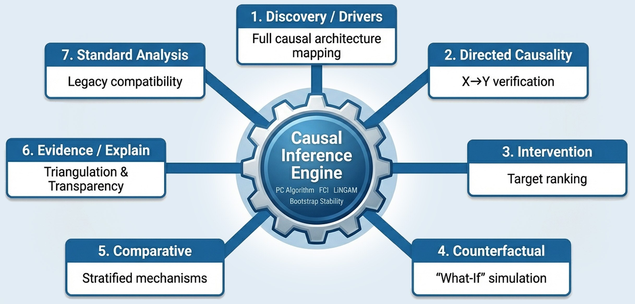 BiRAGAS answers “What causes the difference?” It is a comprehensive engine that integrates constraint-based, score-based, and hybrid methods to address seven distinct analytical intents.