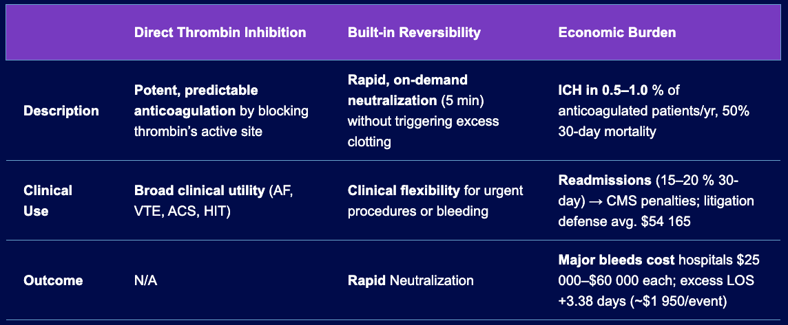 Description Potent, predictable anticoagulation by blocking thrombin’s active site Rapid, on-demand neutralization (5 min) without triggering excess clotting ICH in 0.5–1.0 % of anticoagulated patients/yr, 50% 30-day mortality
