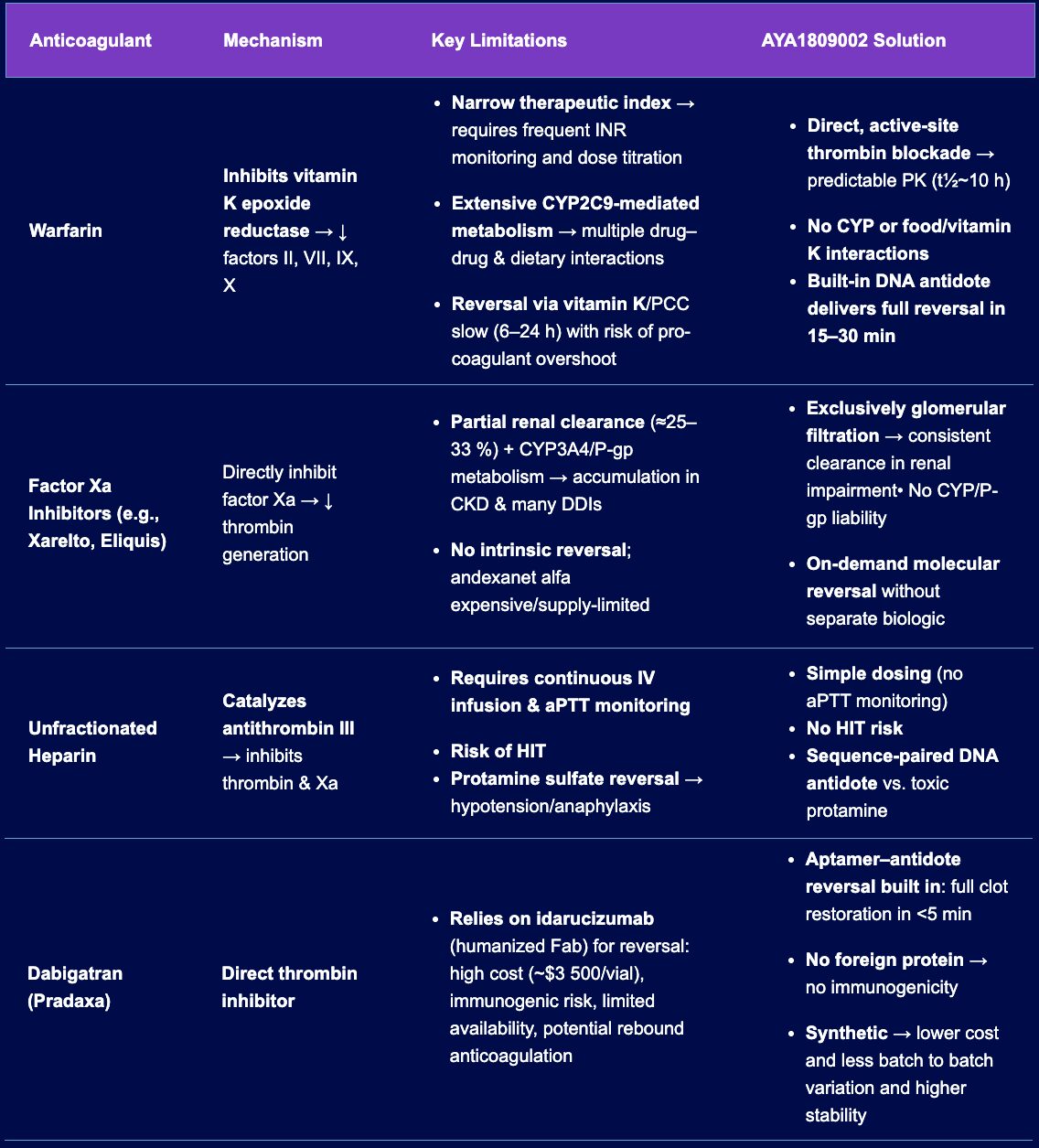 AYA1809002 is a first-in-class, reversible DNA aptamer-based anticoagulant targeting thrombin with high affinity and tunable control via a sequence-paired antidote. It is engineered to provide safe, effective, and rapidly reversible anticoagulation for use in hospital/acute care settings and high-risk patient populations.
